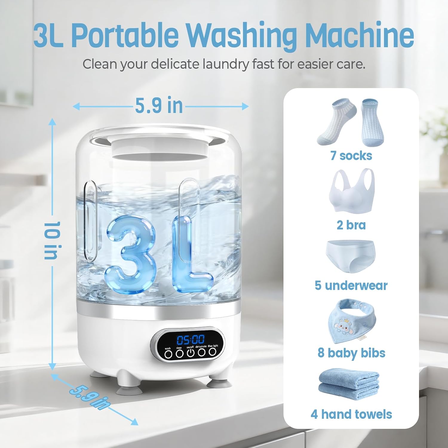 【3L Large-Capacity Washer】: This portable underwear washing machine can clean around 7 pairs of socks or 5 pairs of underwear in a single load. It is also suitable for washing small items such as baby bibs, kitchen towels, and more. Helps you save on water and electricity costs. Weighing only 2.2 lbs with a compact design, it is an ideal choice for apartments, homes, dorms, travel, RVs, or camping. ⚠️ Not recommended for washing large garments (e.g., dresses, pants, sweaters, shirts, etc.).
