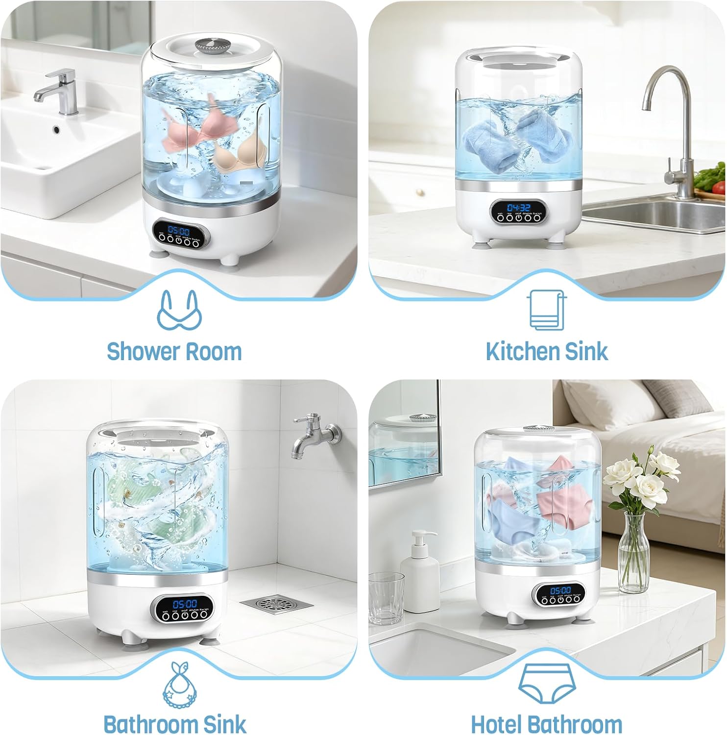 【4-in-1 Mini Washing Machine】: This portable washer features built-in wash (5 min), rinse (5 min), and spin (3 min) mode buttons, giving you full control over your laundry routine—say goodbye to tedious hand-washing or long soaking. Its dedicated intimate apparel mode keeps your delicates separate from everyday laundry, offering a specialized and mindful wash for delicate fabrics.