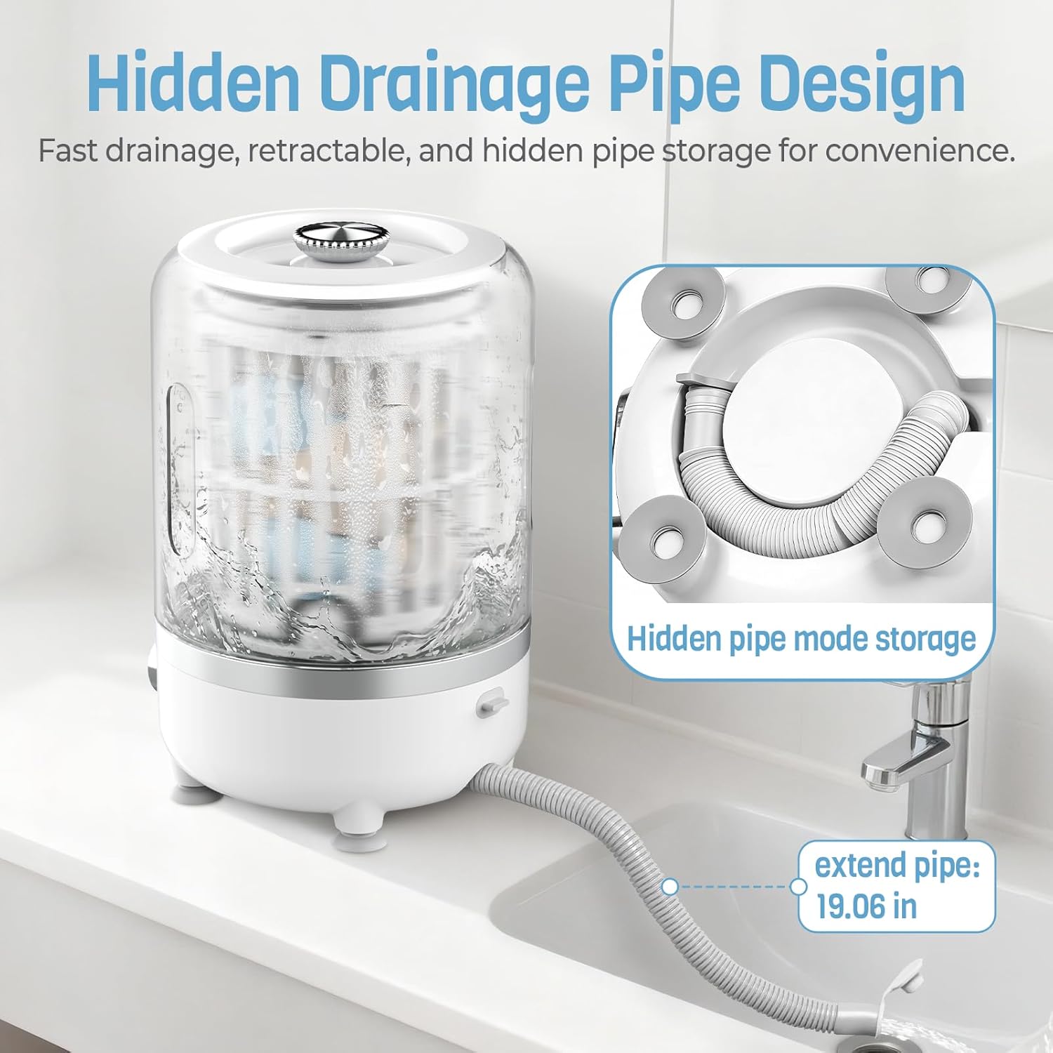 【Effortless Drainage System】:This portable washing machine features a concealed drain hose and a spin-dry basket. The hose extends and retracts freely, and can be shortened for compact storage underneath the unit when not in use. The curved basin opening, paired with a secure, sealed lid, effectively contains water to prevent leaks and splashes during operation. This design ensures a tidy washing area and offers a truly convenient solution for caring for your small laundry items.
