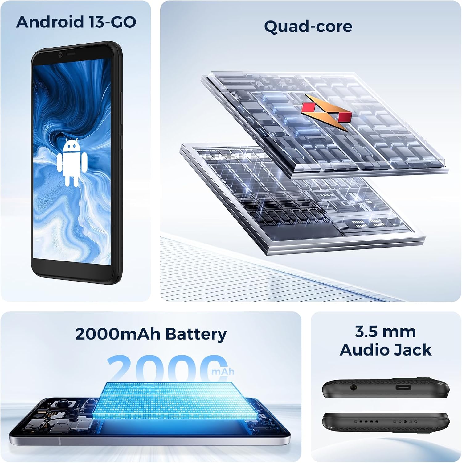 New Unlocked 4G Smartphone Android 13 Go Edition – 5.5″ Display, 2GB+16GB Storage, 2000mAh Battery, 2MP Main + 0.3MP Auxiliary Camera, Dual SIM, 3.5mm Headphone Jack