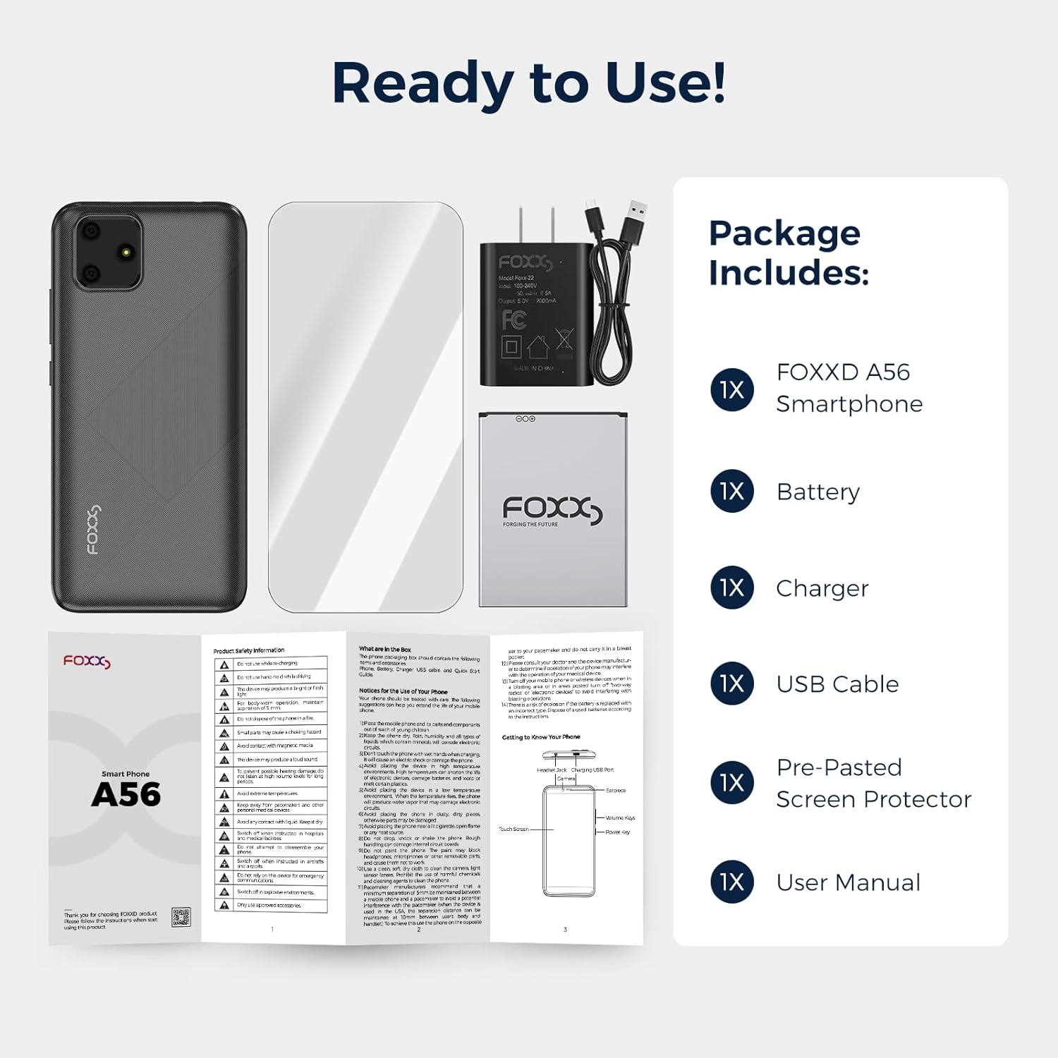 Package Includes: 1 x FOXXD A56 Smartphone 1 x Battery 1 x Charger 1 x USB Cable 1 x Pre-Pasted Screen Protector 1 x User Manual