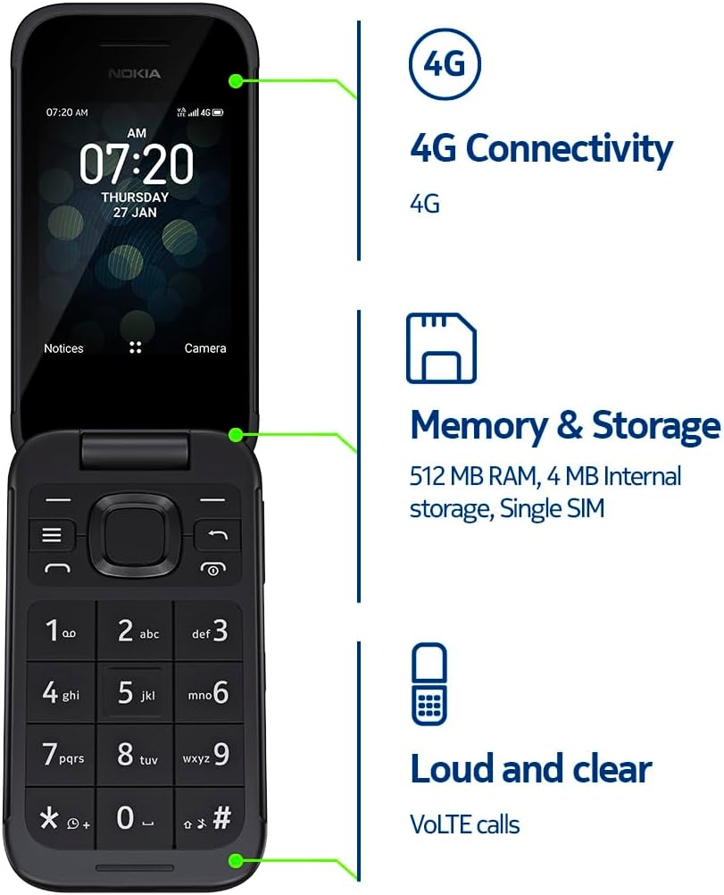 With its simple, easy to use interface, and with the modern features you need, the Nokia 2780 Flip phone is a modern twist on the classic flip now with 4G. With its intuitive design it already feels familiar. It comes with two large screens, to make texting easy and seeing who’s calling even easier. Rigorously crafted to our high durability standards, this is a phone that’s designed to outlast the bumps and knocks of everyday use. Accessibility features on Nokia 2780 Flip include big buttons, hearing aid compatibility and real-time text (RTT) to ensure this is a phone for everyone and the dedicated side button can be programmed to quickly dial a loved one in case of emergency. FM radio and 3.5mm audio jack so you can listen to music wherever you go. Enjoy up to 18 days of standby time from a single charge. Even if you only use your phone once a month, it’s ready when you are. And the 7 hours of talk time, ensures that you stay connected with friends and family for longer. Use your favorite apps and even browse the internet – all on 4G. VoLTE 4G means all your voice calls will be clearer and in HD quality. Plus, the Nokia 2780 Flip comes with a loudspeaker and adjustable volume as well as a 5 MP rear-camera. Video recording and playback is also included, for when you want to capture those longer memories.