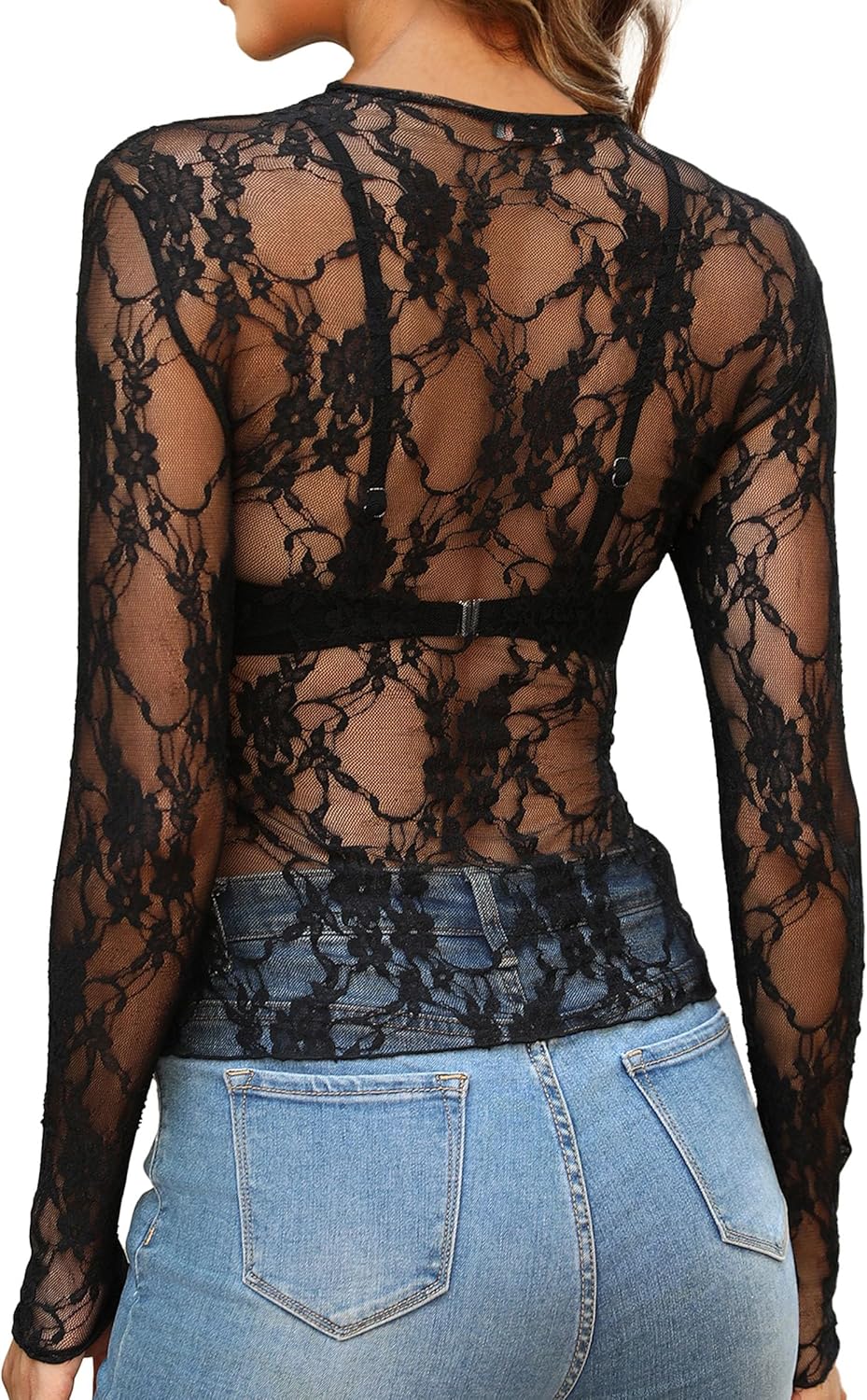 OFEEFAN Womens Mesh Tops Lace Long Sleeve Shirts Crewneck Slim Fitted Outfits See Through Blouses