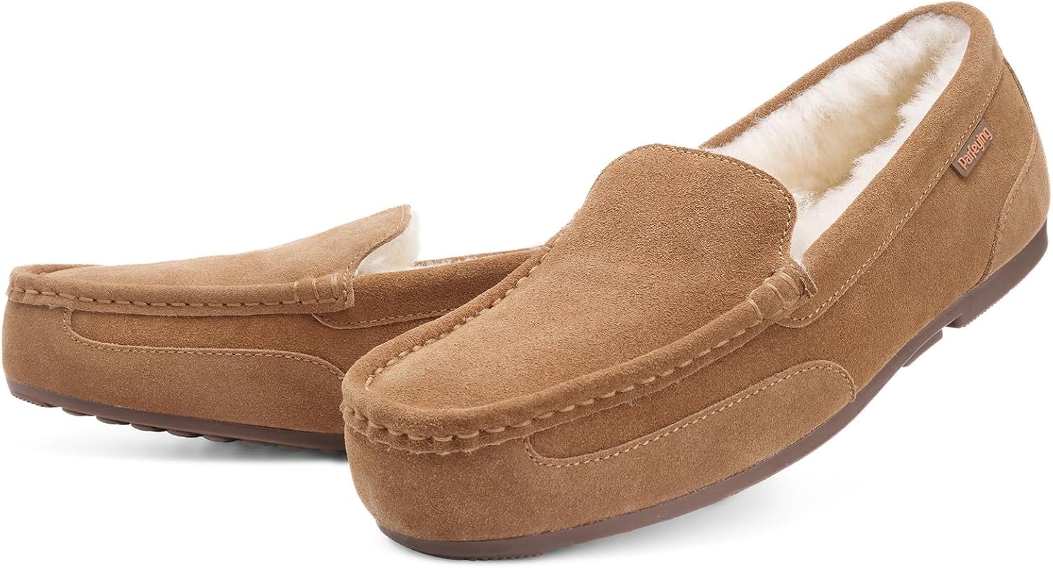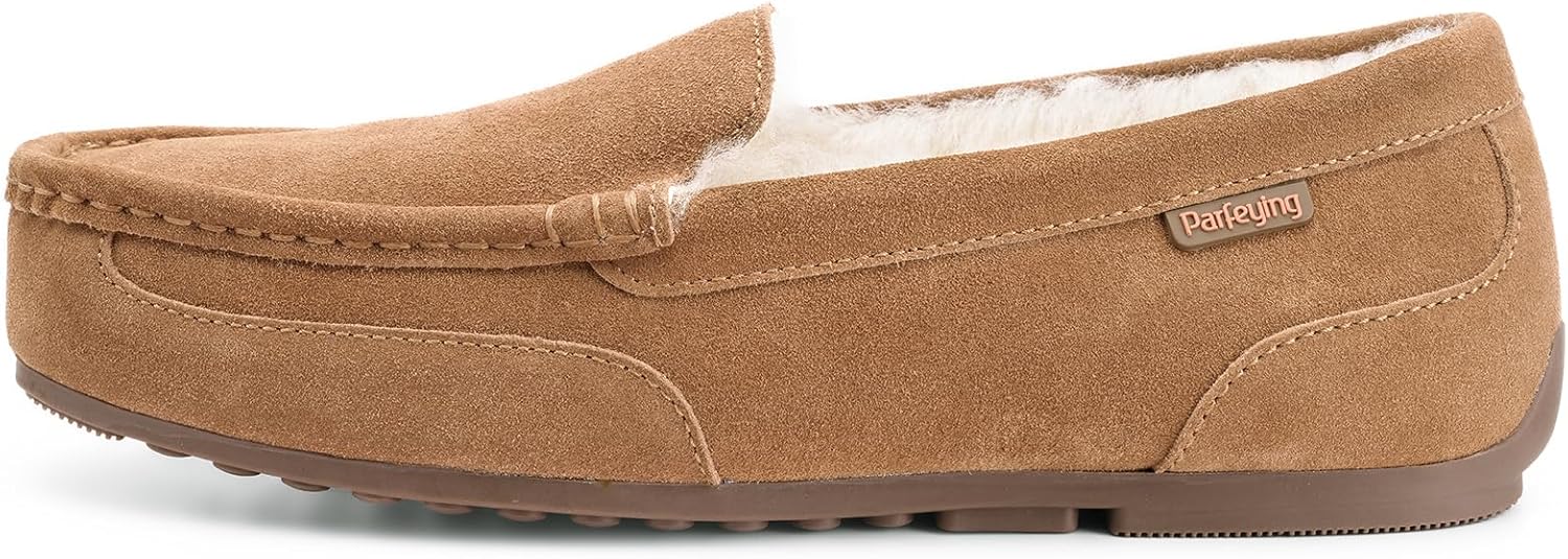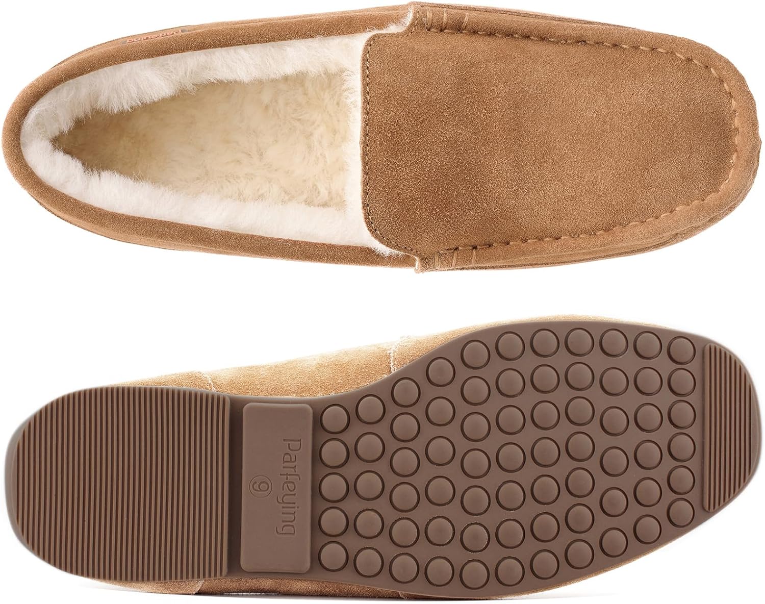 Parfeying Men’s Indoor Outdoor Sheepskin Moccasins Slippers Memory Foam Driving Style Shoes