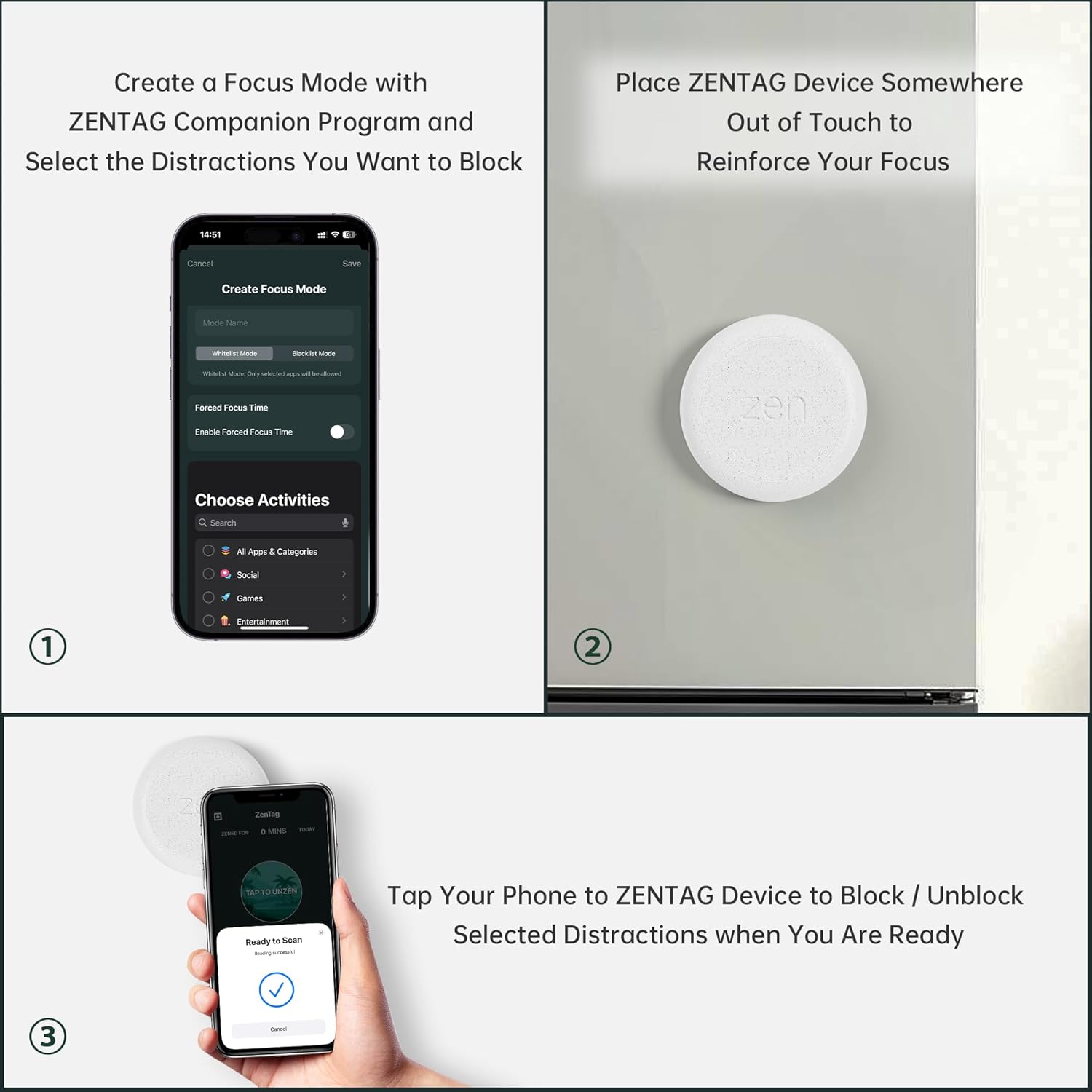 How to Use ZENTAG: Setup in ZENTAG companion program – Select single items, categories, or all features to block/allow and save your modes. Choose mode and activate with a tap – Touch your phone to ZENTAG to lock/unlock instantly. Two Blocking Modes – Whitelist (allow only selected) or Blacklist (block selected).