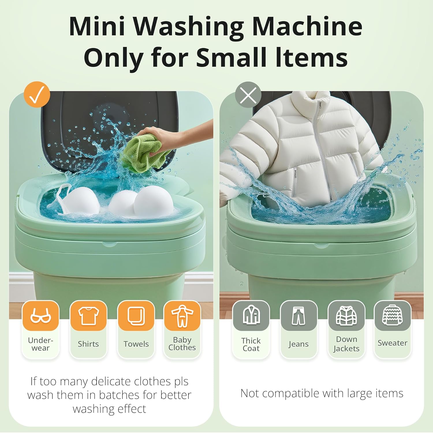 【🌀 Powerful Cleaning with Blue Light】The mini washing machine simulates hand scrubbing with a suitable washing speed, strong decontamination, and built-in blue light. Perfect for delicate clothes, baby garments, or intimate wear, helping you and your family maintain healthy hygiene. 【Not suitable for large items】