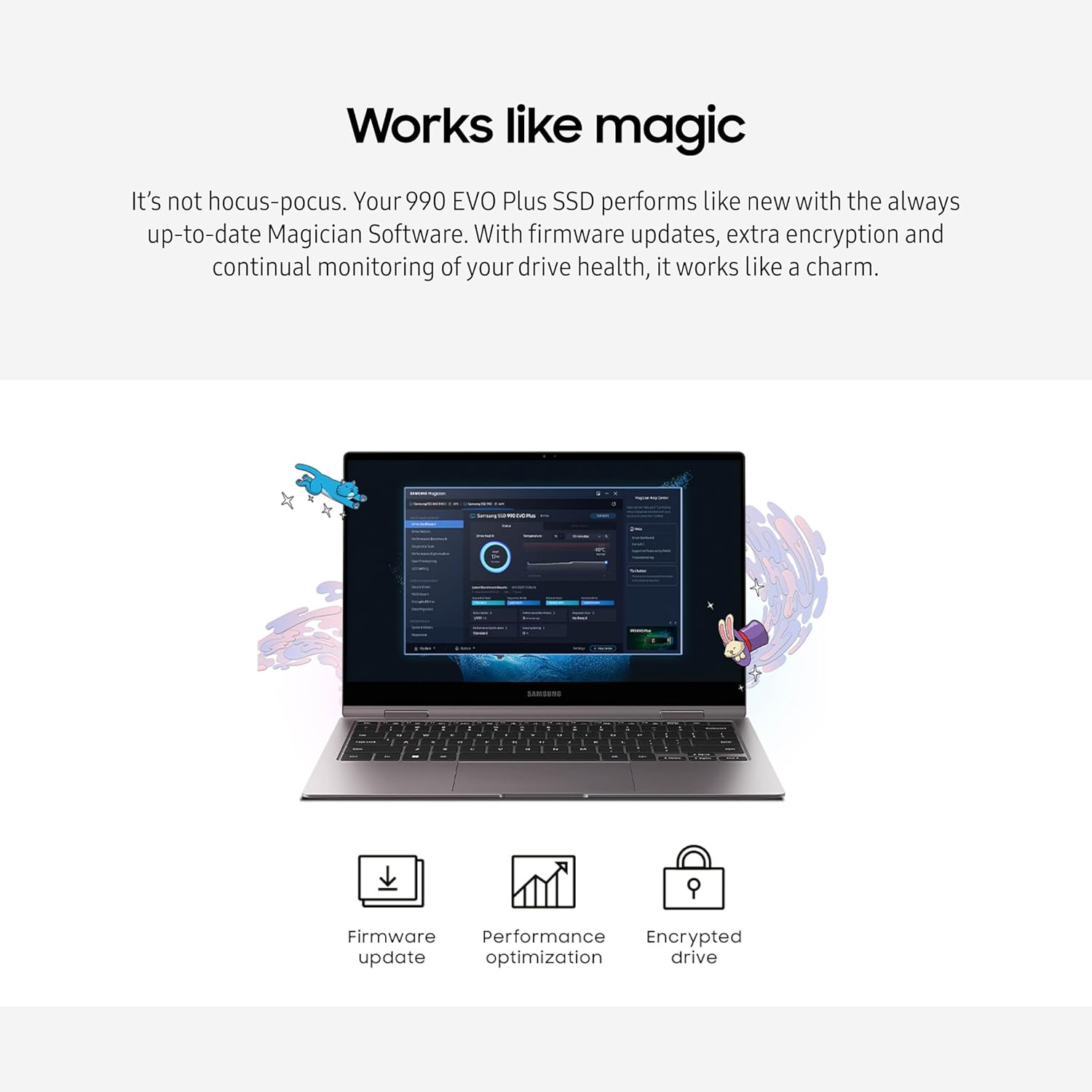 NEVER MISS AN UPDATE: Your 990 EVO Plus SSD performs like new with the always up-to-date Magician Software. Stay up to speed with the latest firmware updates, extra encryption, and continual monitoring of your drive health–it works like a charm.