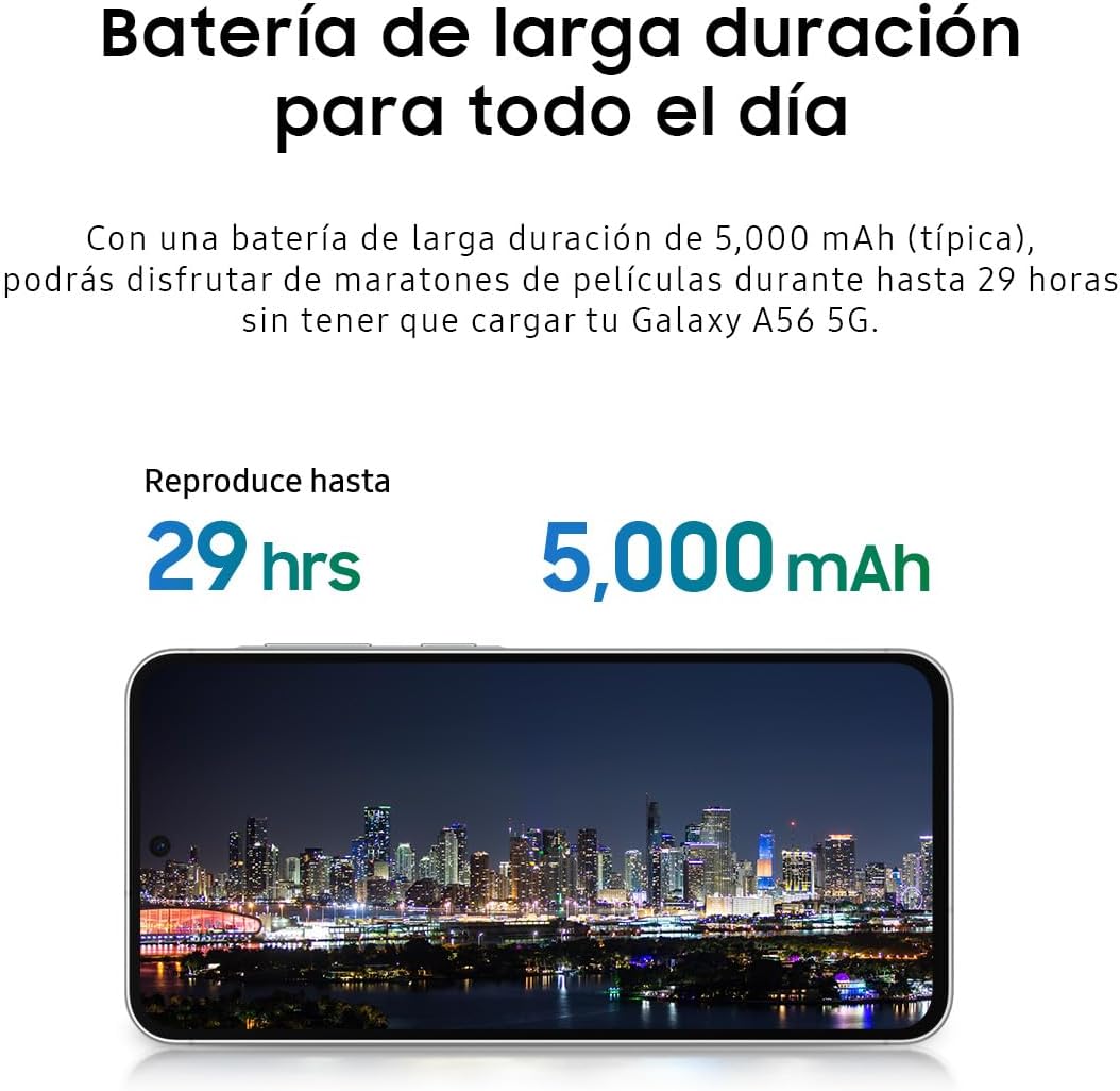 Awesome Intelligence – Circle it, Find it Circle to Search with Google is available on Galaxy A56 5G. Just circle, highlight or tap an object or text onscreen to get Google Search results. Turn photos into masterpieces Object Eraser removes unwanted distractions in the background will be recognized, removed and filled in to make a flawless photo. Capture memories in great detail Get excellent photos and videos with the upgraded 50 MP camera on Galaxy A56 5G. It identifies the sky, skin, face, hair and grass and enhances the image quality for you instantly. Shoot awesome selfie videos Take amazing videos of your adventures and everyday life in Super HDR. The front camera of Galaxy A56 5G is enhanced to get optimal colors and contrast for high res selfie videos. Play to win with next-gen AP Experience the powerful performance of the upgraded Octa-core processor. Plus, with a boosted cooling system and storage up to 256 GB, you can multitask, stream and play games more seamlessly than ever. Display for immersive gameplay Fully immerse in your favorite entertainment with a large 6.7-inch FHD+ Super AMOLED display. The 1,200-nit Vision Booster adds clarity for an awesome viewing experience, in any lighting. Strong durability The solid metal frame and Corning Gorilla Glass Victus+ keep the Awesome design of Galaxy A56 5G looking great. Plus, with IP67 protection, the new Galaxy A series is safe from dirt and splashes.