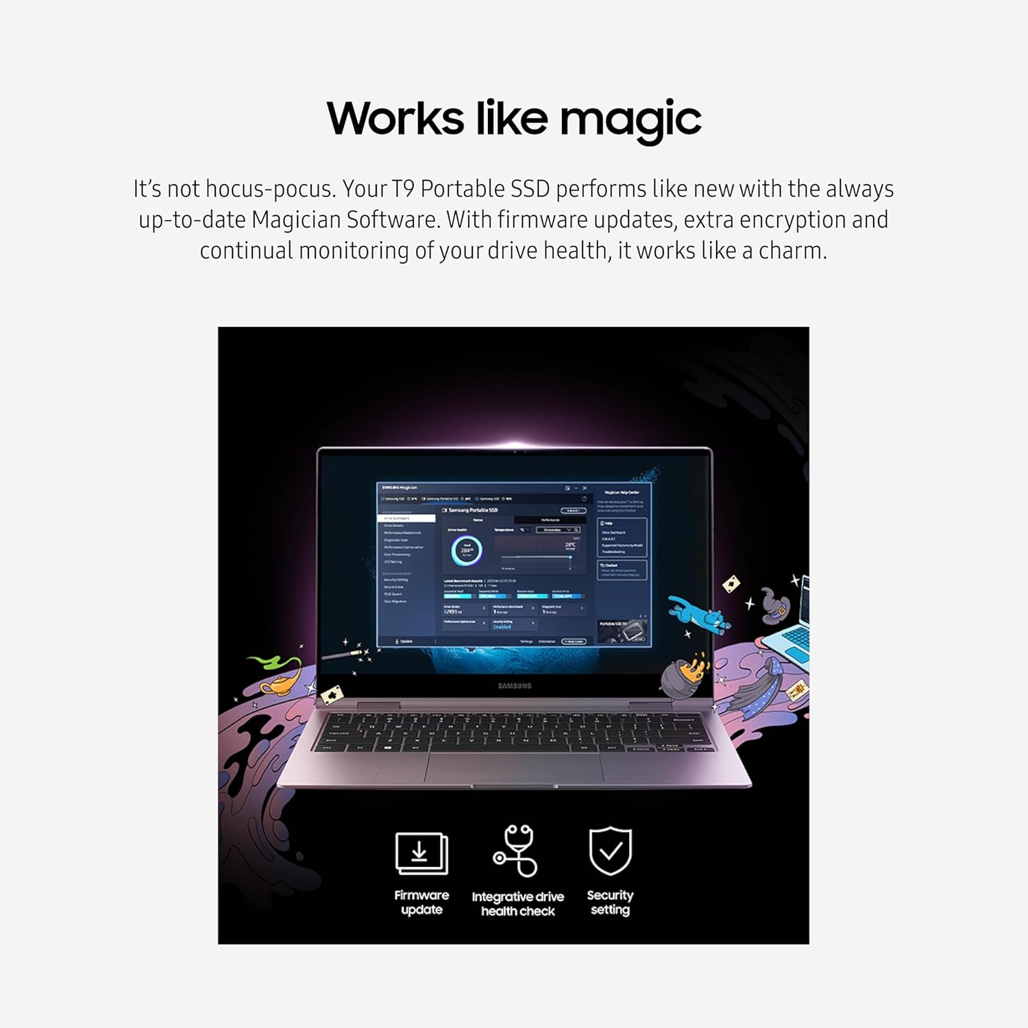 SAMSUNG MAGICIAN SOFTWARE: Your T9 Portable SSD performs like new with the always up-to-date Magician Software; Stay up to speed with the latest firmware updates, extra encryption and continual monitoring of your drive health
