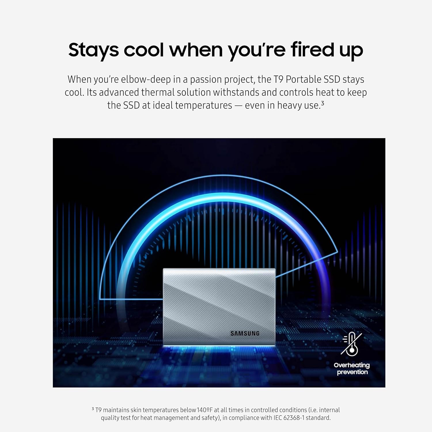 DYNAMIC THERMAL GUARD: When you’re elbow-deep in a passion project, the T9 Portable SSD stays cool; Its advanced thermal solution withstands and controls heat to keep the SSD at ideal temperatures—even in heavy use**