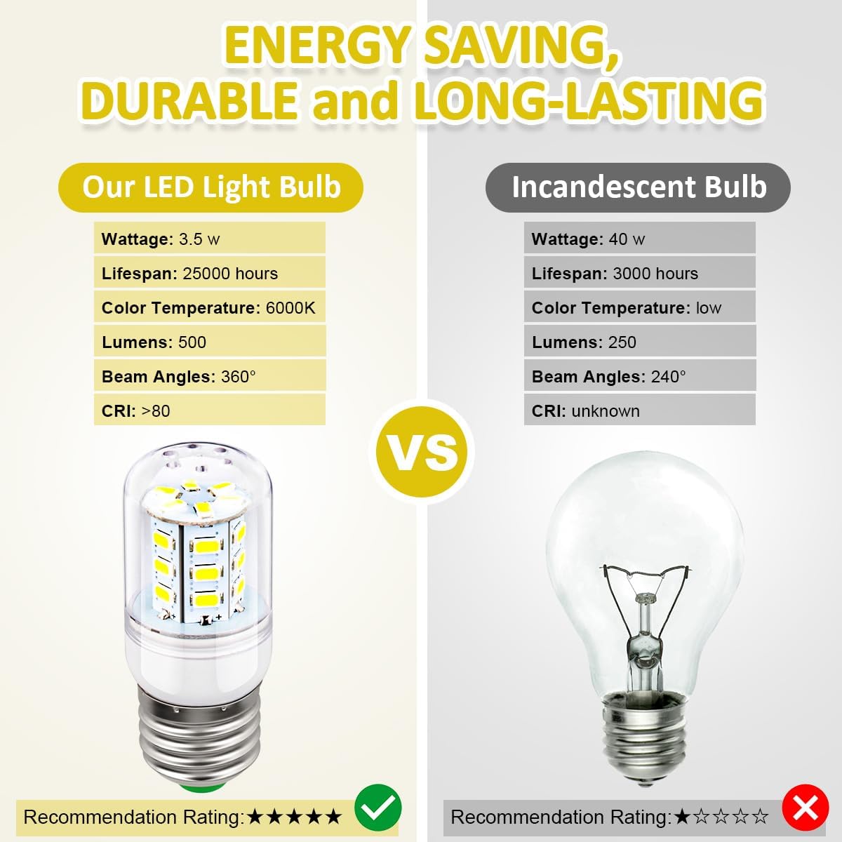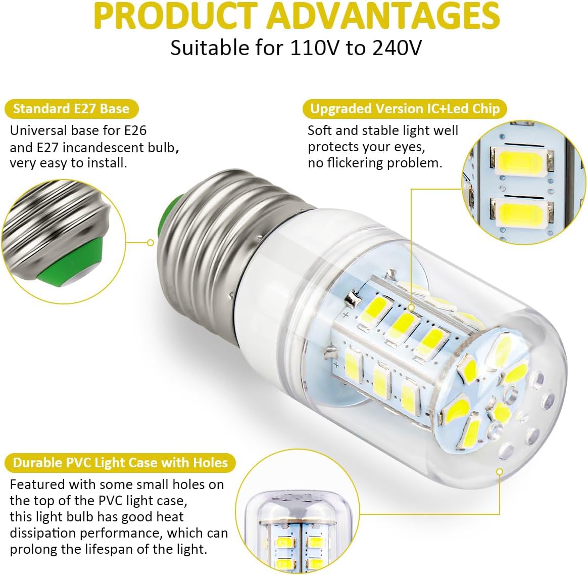 Voltage:110V-240V,Wattage:3.5w. 3.5W LED light is equivalent to 30W-50W ordinary light, brighter and more power saving. Package Includes: 1 x refrigerator light bulb.