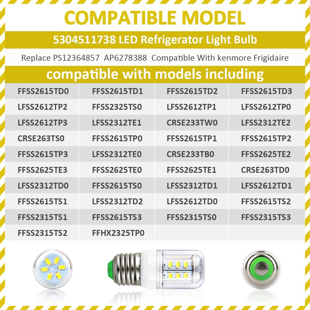 5304511738 LED Refrigerator Light Bulb Adaptive model KEI D34L, KEID34L, 3418L, KEL3418L, LFSS2612TE0, FSFF2612TE0, FFSS2625TSO, FFSS2325TS0, FFSS2315TSO, LFSS2312TPO, LFSS2612TP2, LFSS2312TF2, LFSS2312TF0, CRSE233TS0, FFSS2625TS1, FFHX2325TP0, LFSS2612TF0, LFSS2312TE0, FFSS2615TP3,LFSS2312TE0,CRSE233TB0,FFSS2625TE2, FFSS2625TE3,FFSS2625TE0,FFSS2625TE1,CRSE263TD0, LFSS2312TD0,FFSS2615TS0,LFSS2312TD1,LFSS2612TD1, FFSS2615TS1,LFSS2312TD2,LFSS2612TD0,FFSS2615TS2.
