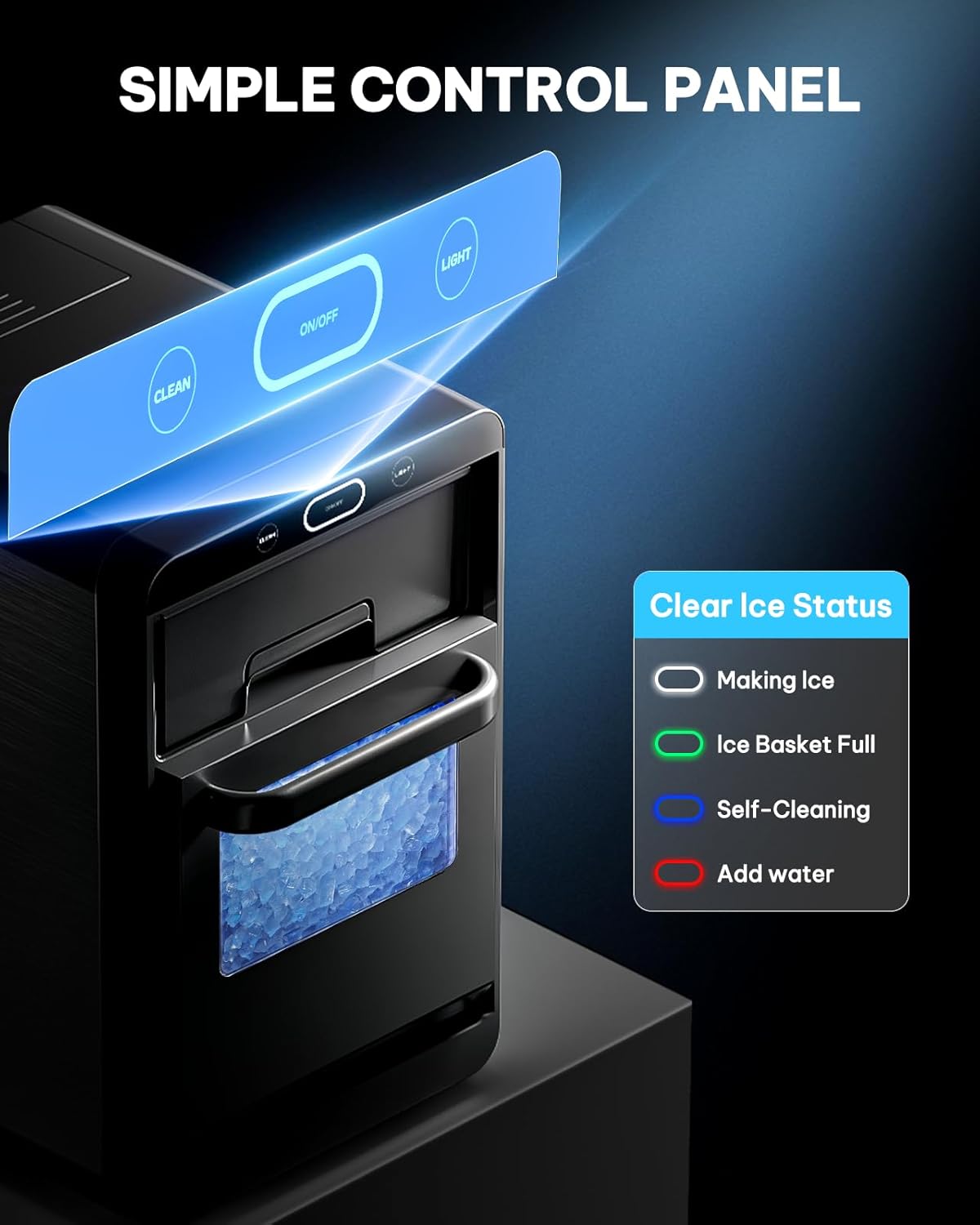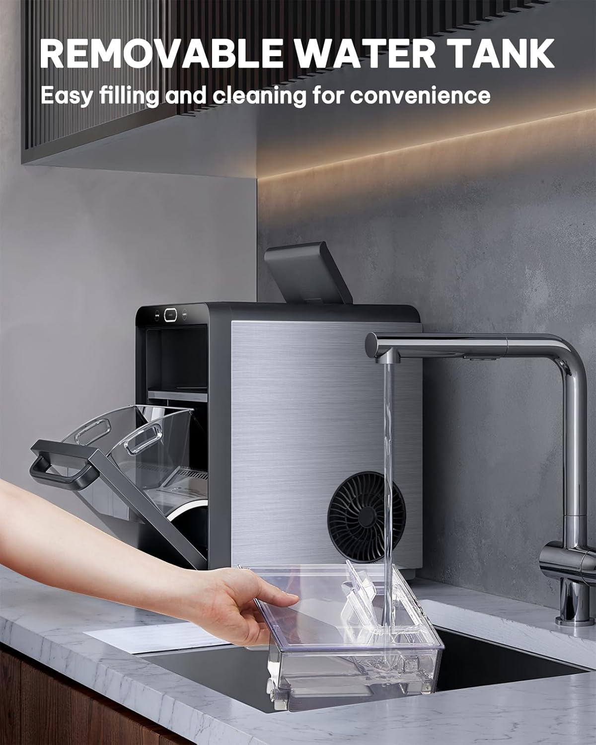 Smart Self-Cleaning Ice Maker System: The countertop ice maker simplifies maintenance with one-touch auto cleaning cycle. Removable components (water tank, ice basket) are dishwasher-safe, crucial for nugget ice fresh