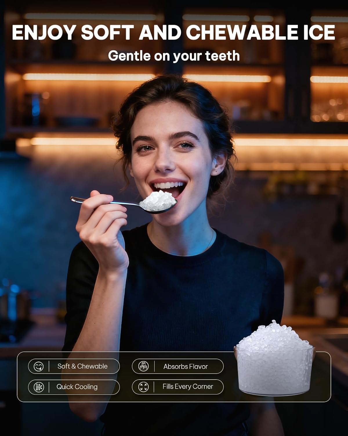 Rapid Pebble & Crushed Ice Production: Silonn pebble ice maker creates soft chewable ice cubes in 10 minutes and produces 44lbs/24h of crushed ice – ideal for smooth texture lovers. The upgraded compressor ensures continuous output for parties/offices without flavor dilution