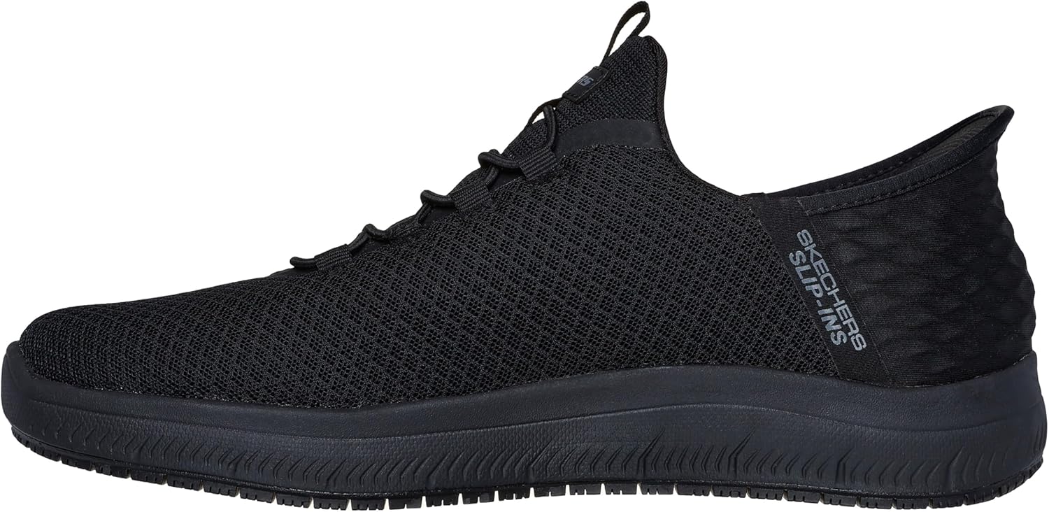 Step into comfort and safety with these Skechers Work Slip Resistant Summits Colsin work shoes for men. These non slip work shoes for men feature a knit mesh and synthetic upper with convenient slip-on design, making them perfect for long work days. The Air-Cooled Memory Foam insole and Heel Pillow technology provide exceptional comfort, while the slip-resistant outsole offers reliable traction on various surfaces. Ideal for professionals seeking work shoes for men that combine safety features with athletic comfort.