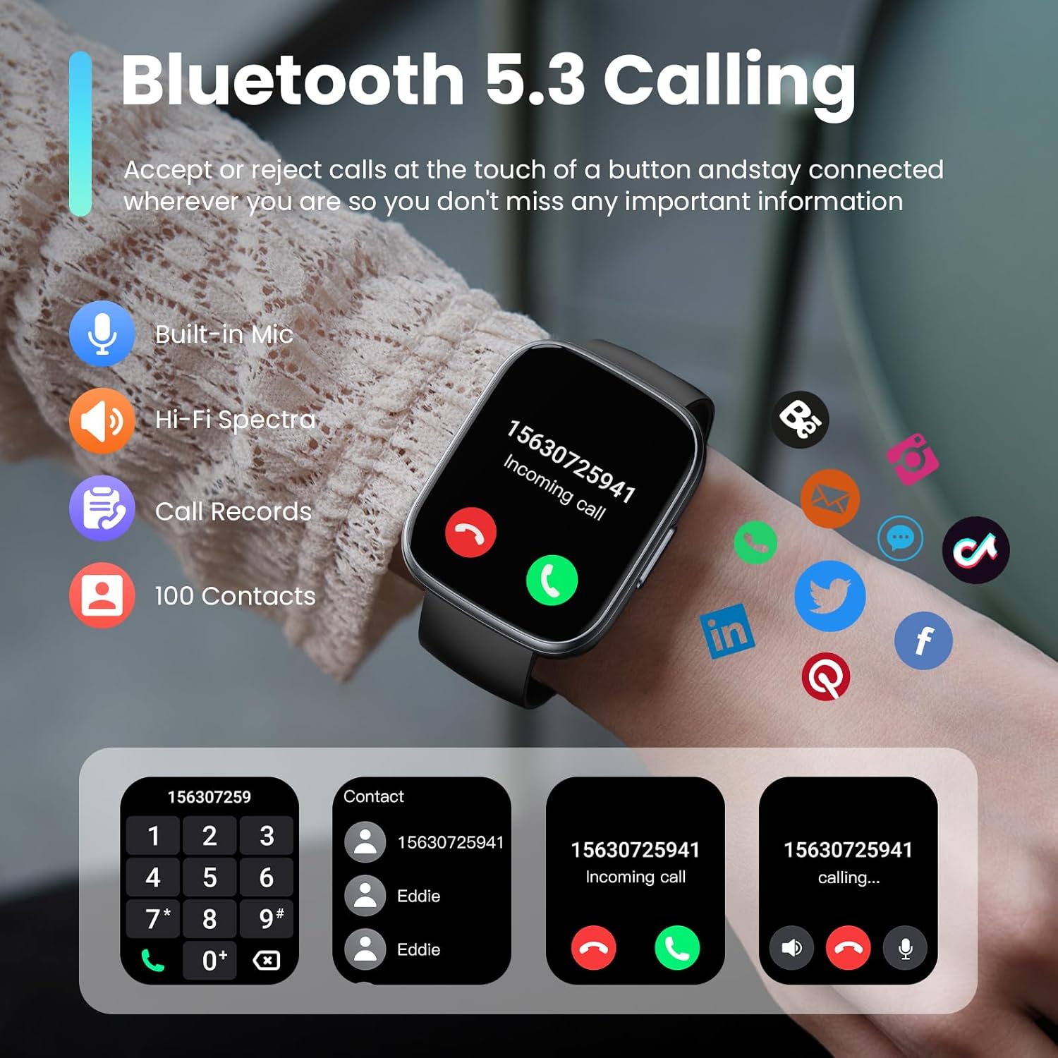 All-Day Health & Fitness Companion: T80 smart watch is equipped with a high-precision optical sensor that supports 24h real-time heart rate monitoring, helping you stay informed about your physical condition. This smart watch records 100+ sports modes like running, cycling, and yoga. The Fitness tracker is IP68 waterproof, allowing you to wear it during outdoor activities, rainy days, and while washing hands (Note: Do Not use in showers, saunas, swimming etc)