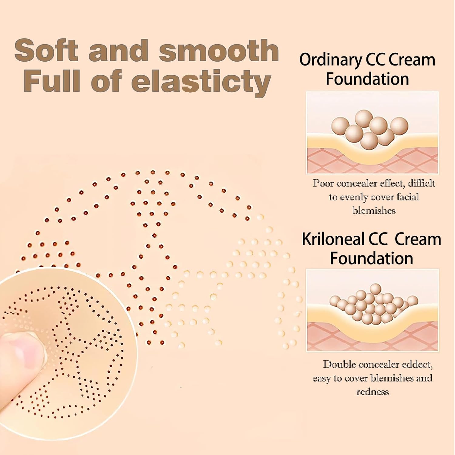 Different: Our cc cream is different from other products. It is very light and not heavy, naked makeup, looks very natural. It won’t cover up very deep blemishes, so apply concealer to deeper blemishes after using cc cream. cc cream and concealer together, this will make your makeup more natural and feel better!