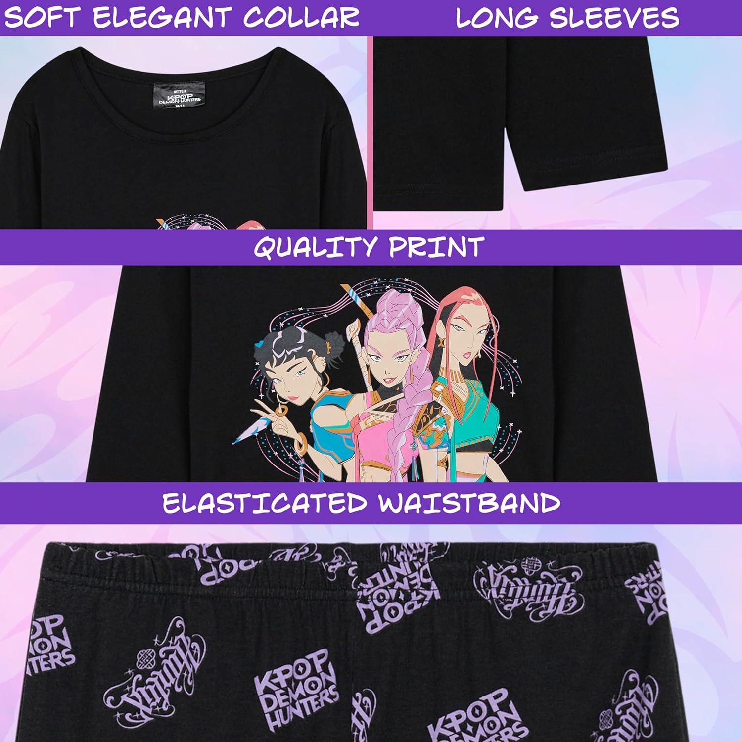 Wrap your nights in cozy comfort and character style with this KPop Demon Hunters pajama set for girls. Designed for young fans of the hit series from 5–14 years, this two-piece sleepwear set includes a soft long sleeve top and full-length trousers with an elastic waistband for a relaxed fit. Whether you’re shopping for lounge sets, cute PJs, or themed gifts for girls, this set blends fandom fun with everyday comfort. Made from a breathable polyester and cotton blend, the fabric is perfect for sleepovers, weekend lounging, and bedtime routines. The pajama trousers include two side pockets for added convenience, making them ideal for casual lounging or storing small bedtime essentials. Fans of Huntrix, Saja Boys, Rumi, Mira, and Zoey will love the detailed graphic prints that bring the characters to life. Perfect for girls and teens who enjoy comfy loungewear, KPop merch, or unique pajama sets, this sleepwear is a must-have. Whether it’s used as nightwear or part of a relaxing day-at-home outfit, it offers the comfort of kids PJs with the excitement of KPop Demon Hunters style. A thoughtful option for birthdays, holidays, or pajama gift sets, this sleepwear keeps bedtime fun and fashionable.