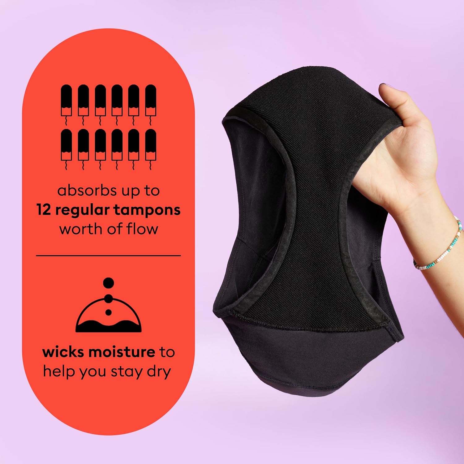 Perfect for light flow days, these women’s incontinence underwear offer reliable protection without bulkiness. Can hold up to 100ml or 6tbps or 1/4 cup worth of liquid.