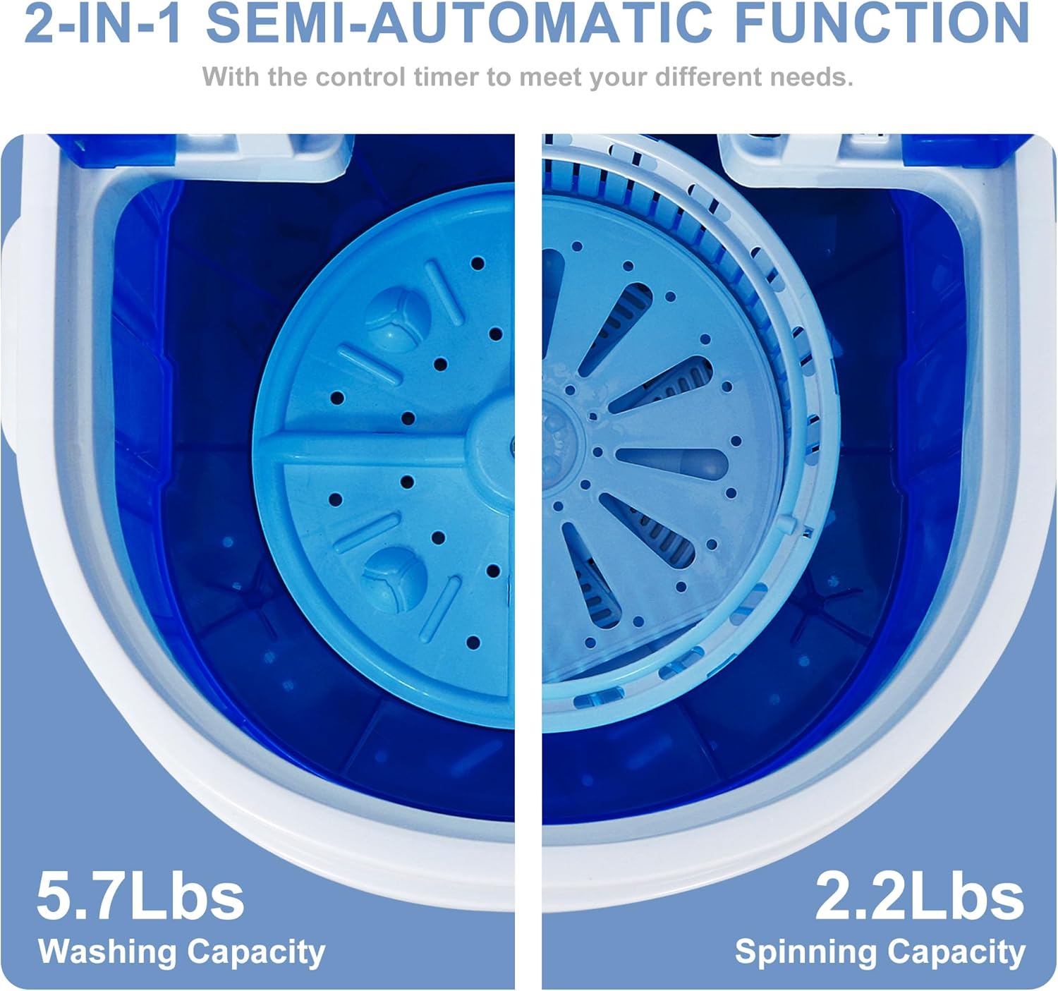 Practical Accessory, Enhancing Convenience — 2-in-1 function allows it can be used as a washing machine and a spinner. Single tub washing machine with spin basket up to 10 minutes (wash) and 5 minutes (spin) with the control timer to meet your different needs. Clear lid to monitor the inner condition.