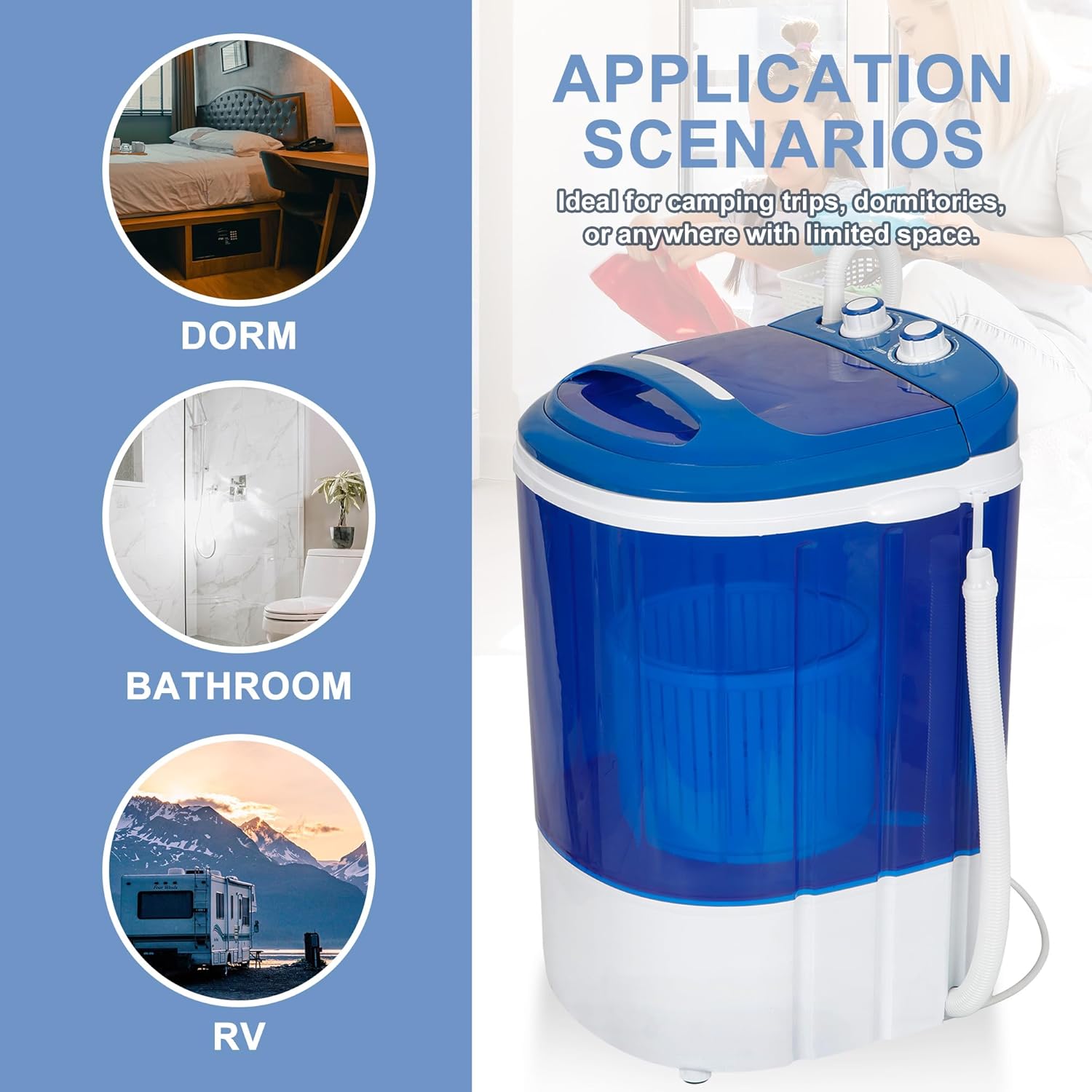 Ultimate Portability, Usable Anywhere — This washing machine offers ultimate portability. Its compact size and lightweight build (with a 5.7 lbs capacity) make it incredibly easy to move and store.It also has a handle on the back and handholds on the side, easy to carry and lift. Whether you’re in a small apartment, a dorm room, or on a camping trip, you can take it along and enjoy clean clothes anytime, anywhere.