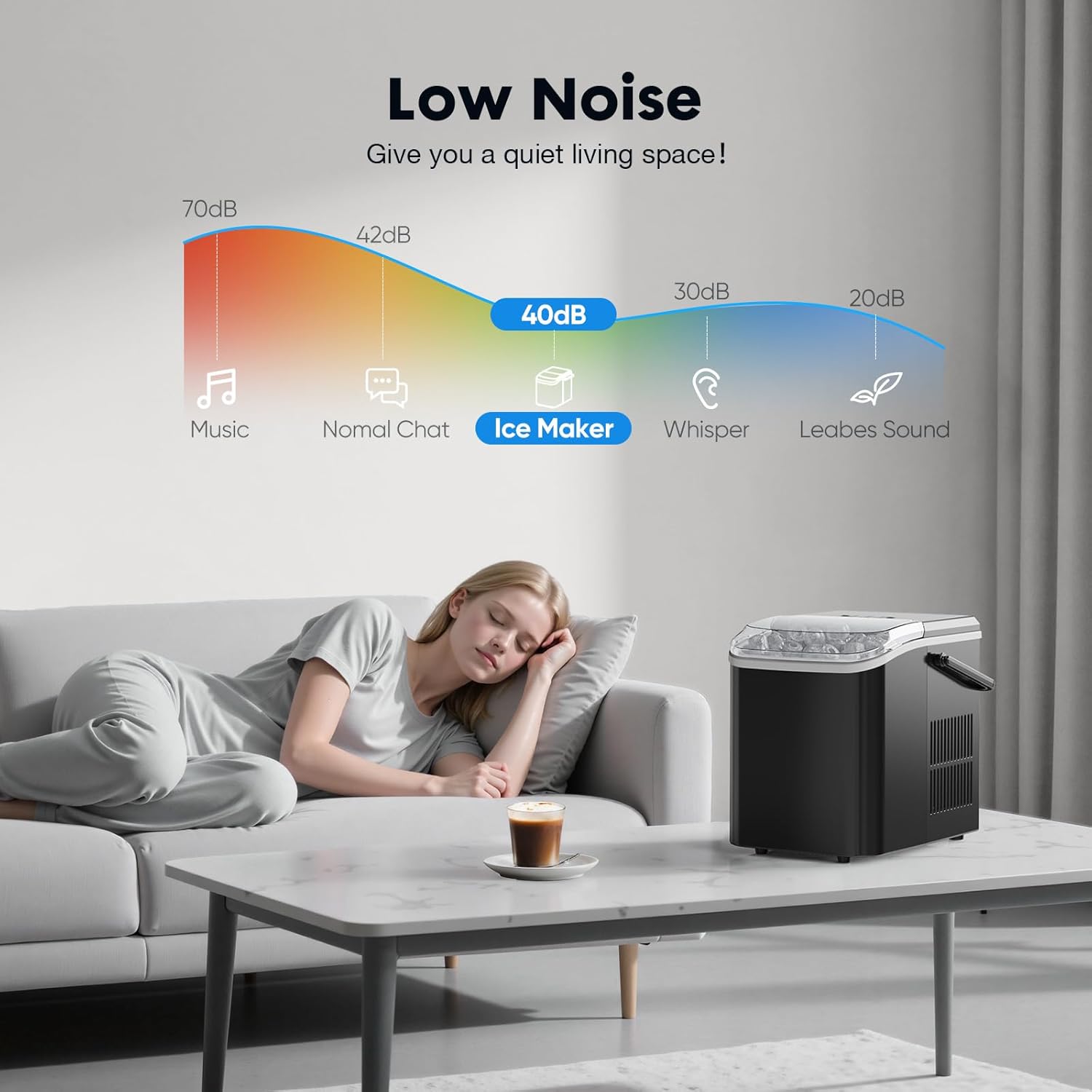 【SMART & SIMPLE OPERATION】The control panel is very easy to operate. Enjoy fresh ice with 3 easy steps! When the water is insufficient or the ice basket is full, the indicator light will turn on. When making ice cubes, the noise is lower than 40dB, similar to a working refrigerator.