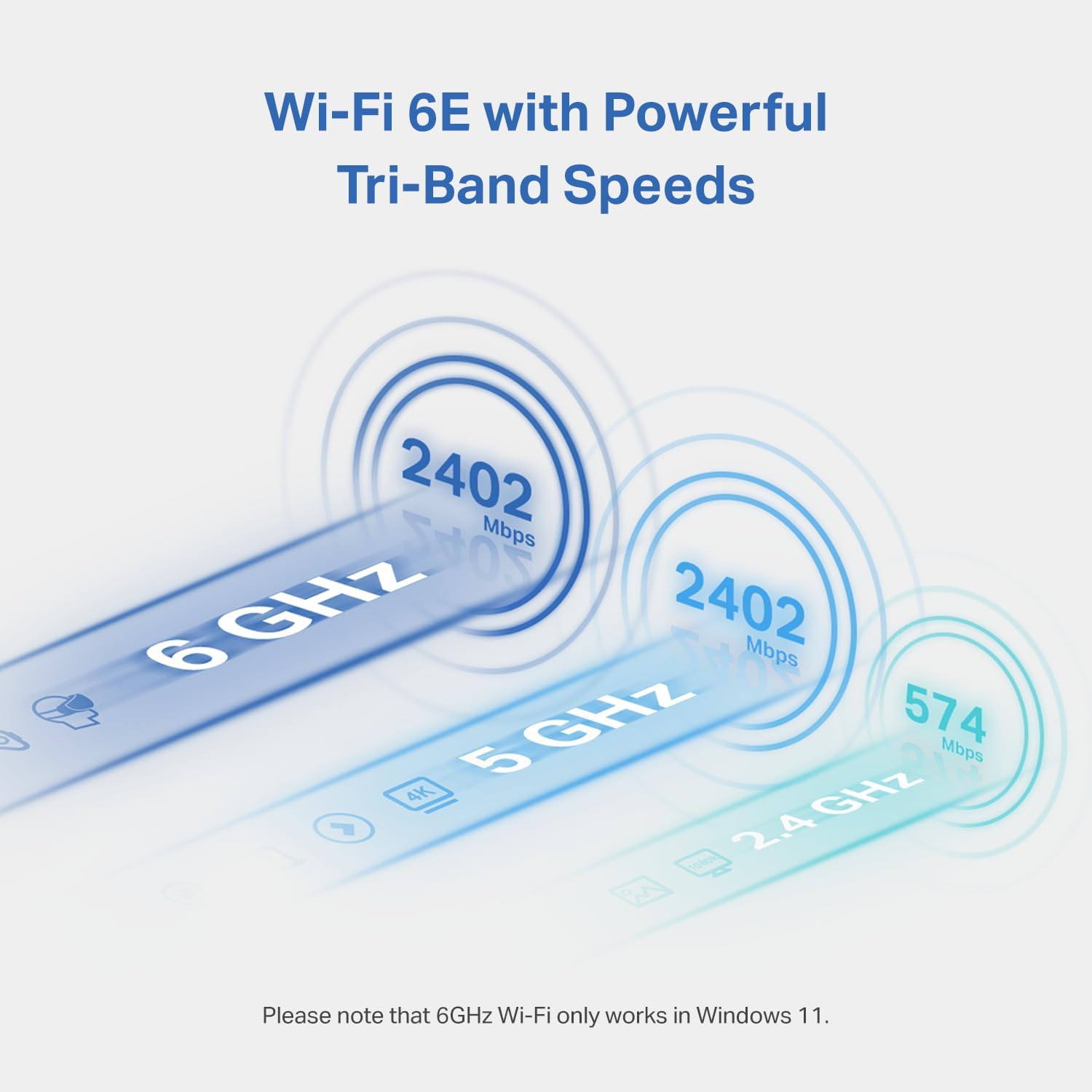 𝐓𝐫𝐢-𝐁𝐚𝐧𝐝 𝐔𝐒𝐁 𝐖𝐢𝐅𝐢 𝐀𝐝𝐚𝐩𝐭𝐞𝐫 – Reach incredible speeds up to 2.4 Gbps (2402 Mbps in 6GHz, 2402 Mbps in 5 GHz or 574 Mbps on 2.4 GHz) with ultra-low latency and uninterrupted connectivity using Wi-Fi 6E technologies. 𝐓𝐨 𝐮𝐭𝐢𝐥𝐢𝐳𝐞 𝟔𝐆𝐇𝐳 𝐖𝐢-𝐅𝐢, 𝐭𝐡𝐞 𝐮𝐬𝐞𝐫 𝐧𝐞𝐞𝐝𝐬 𝐭𝐨 𝐛𝐞 𝐮𝐬𝐢𝐧𝐠 𝐖𝐢𝐧𝐝𝐨𝐰𝐬 𝟏𝟏.