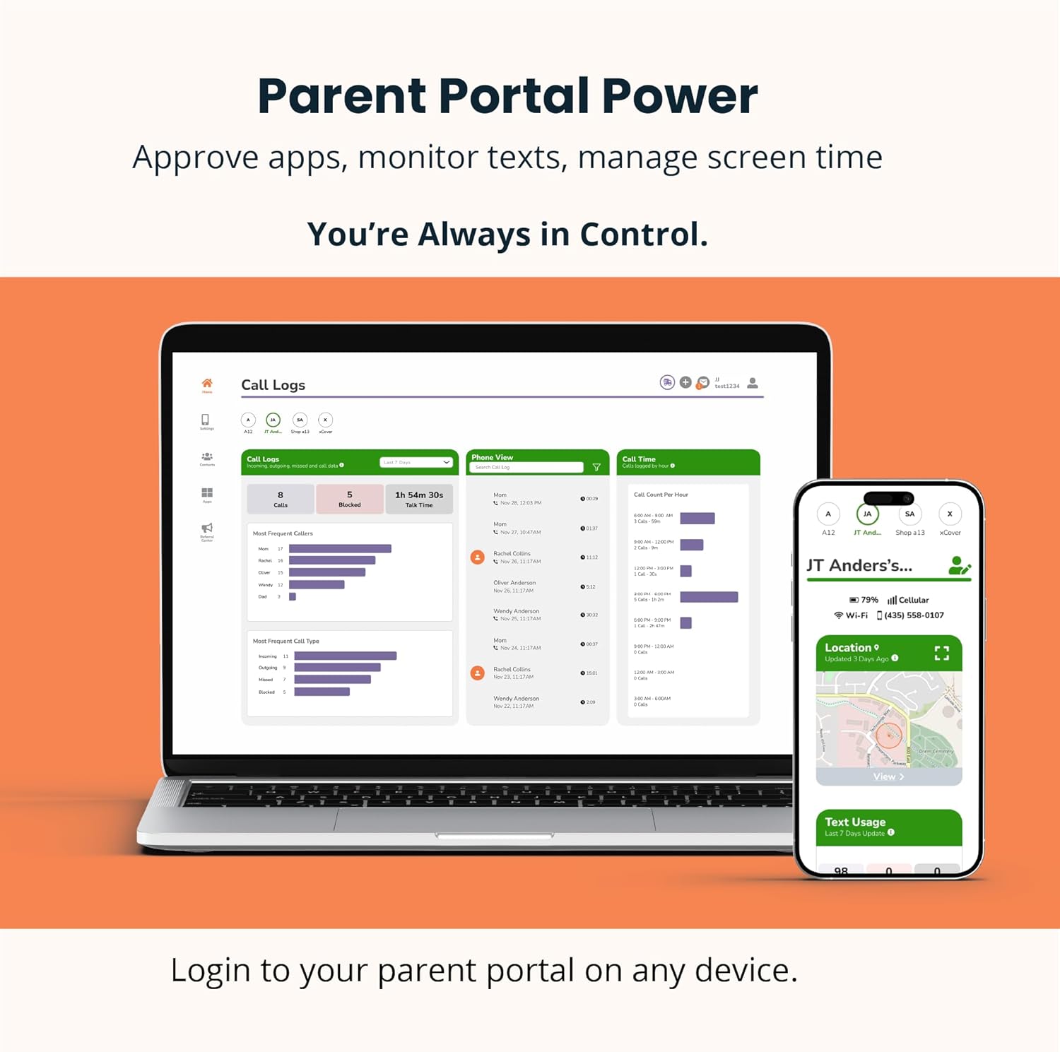 SCREEN TIME MANAGEMENT MADE SIMPLE: Set healthy phone habits with custom schedules, daily time limits, and app-specific restrictions-all remotely through the Parent Portal.