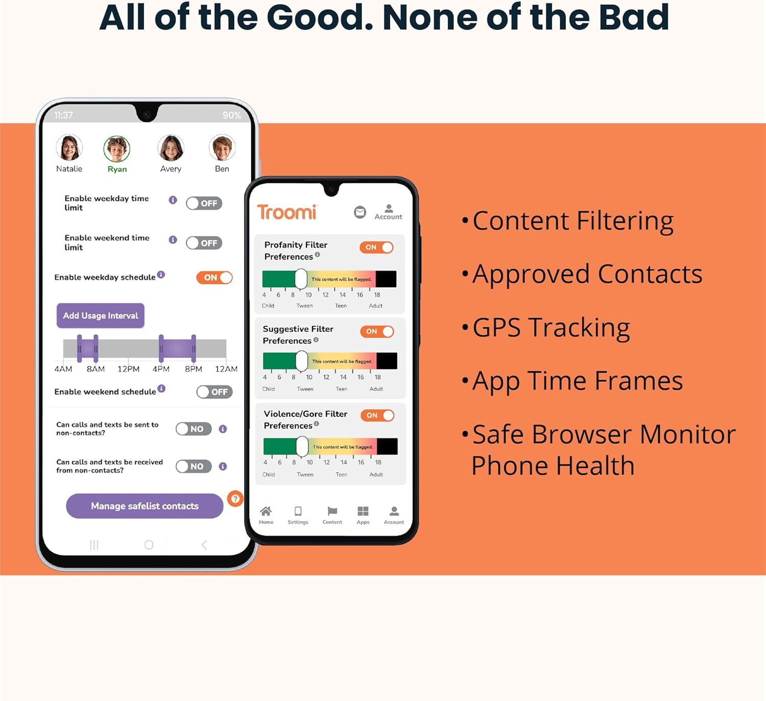 SAFE & SECURE SMARTPHONE FOR KIDS: Designed with built-in parental controls so you can manage apps, contacts, screen time, and location, all from the Troomi Parent Portal on your own device. No social media, no open app stores, no stress.