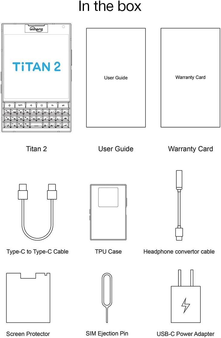 Titan 2, User Guide, Charger, Cable, TPU Case, Screen Protector Film, Headphone Adapter, Sim Eject Pin