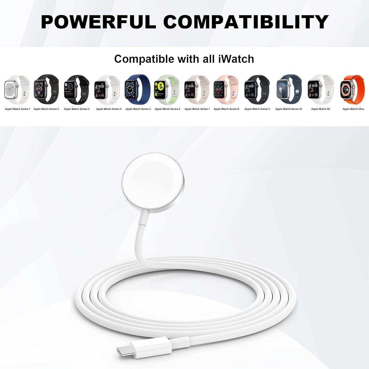 【Compatible Apple Watch Models】: This charging cable works with Apple Watch Series 1, Apple Watch Series 2, Apple Watch Series 3, Apple Watch Series 4, Apple Watch Series 5, Apple Watch Series 6, Apple Watch Series 7, Apple Watch Series 8, Apple Watch Series 9, Apple Watch SE, Apple Watch Ultra, Apple Watch Sport, Apple Watch Hermès, and Apple Watch Edition. It fits all case sizes including 38mm, 40mm, 41mm, 42mm, 44mm, and 45mm versions.