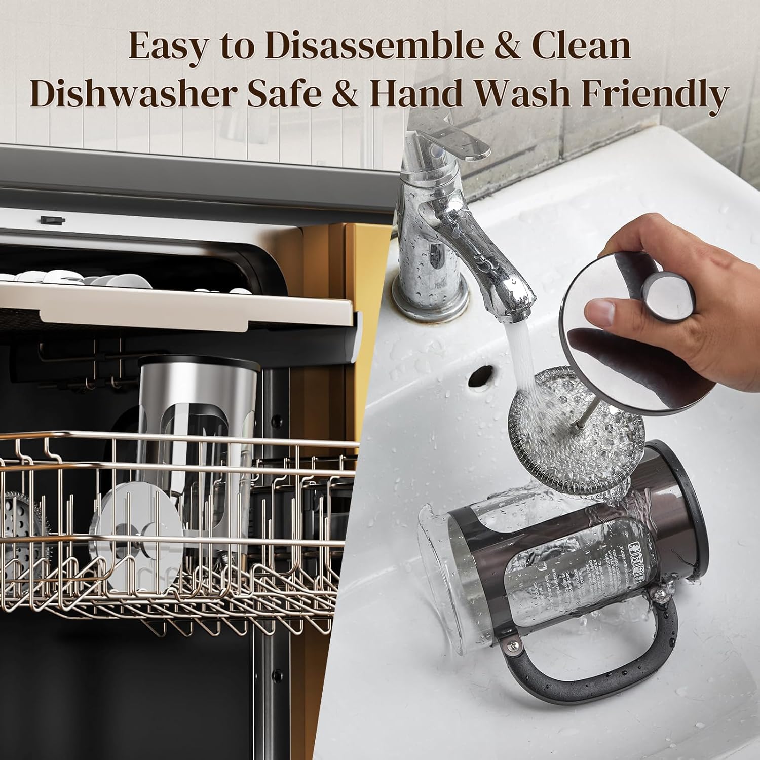 Easy to Clean: Designed for hassle-free cleanup, the glass carafe disassembles easily for handwashing, while key components like the plunger and filter are dishwasher-safe—ensuring a thorough, convenient clean after every brew