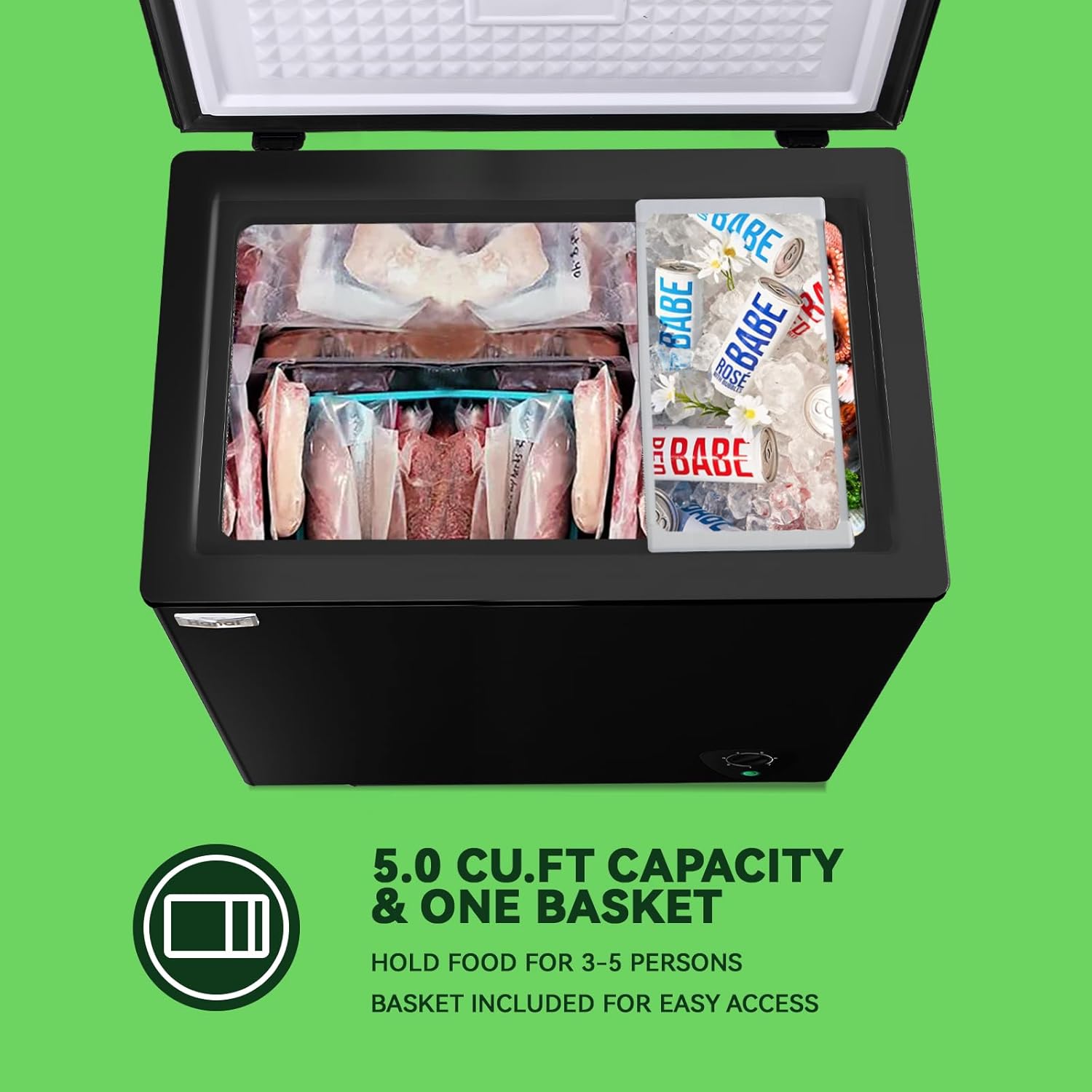 IDEAL FOR YOUR KITCHEN: Black deep freezer has a large 5.0 cu.ft capacity, so you do not have to worry about not having room to store more food; With one removable basket, various shapes of food can be combined and stored