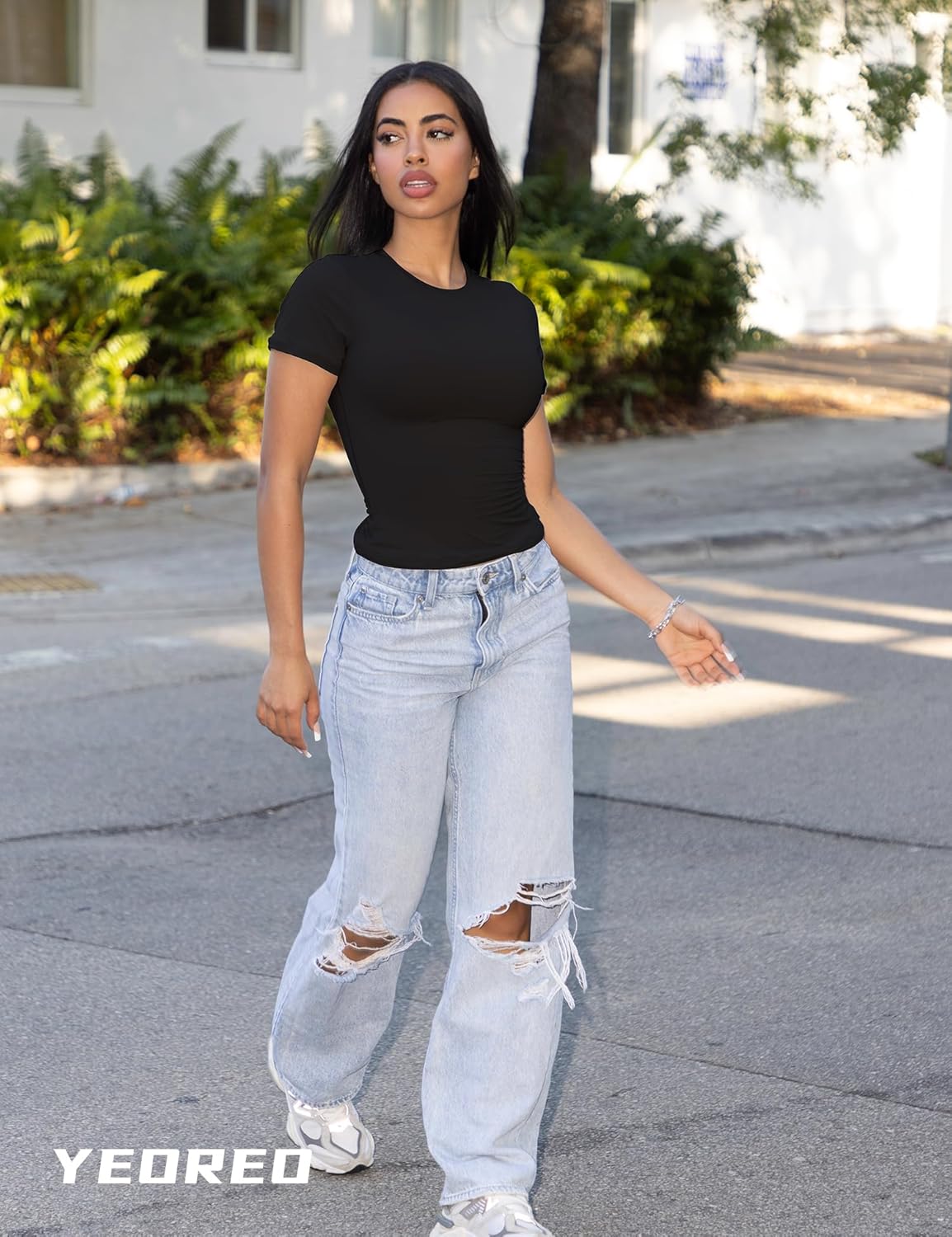 Buy YEOREO Women Fitted Workout Tops Short Sleeve Double Lined Basic Y2K Going Out Crew Neck Compression Crop Top online from amazon or ebay or walmart YEOREO Women Fitted Workout Tops Short Sleeve Double Lined Basic Y2K Going Out Crew Neck Compression Crop Top